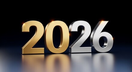 Gleaming 3D metallic numbers showcasing the year 2026, symbolizing a fresh start, future goals, and upcoming achievements against a sophisticated dark background