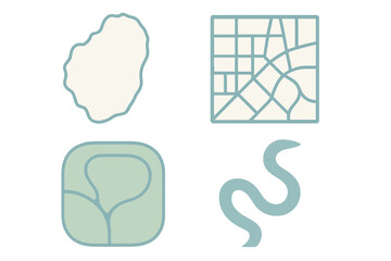Various shapes represent geographical features and mapping elements for design and educational purposes