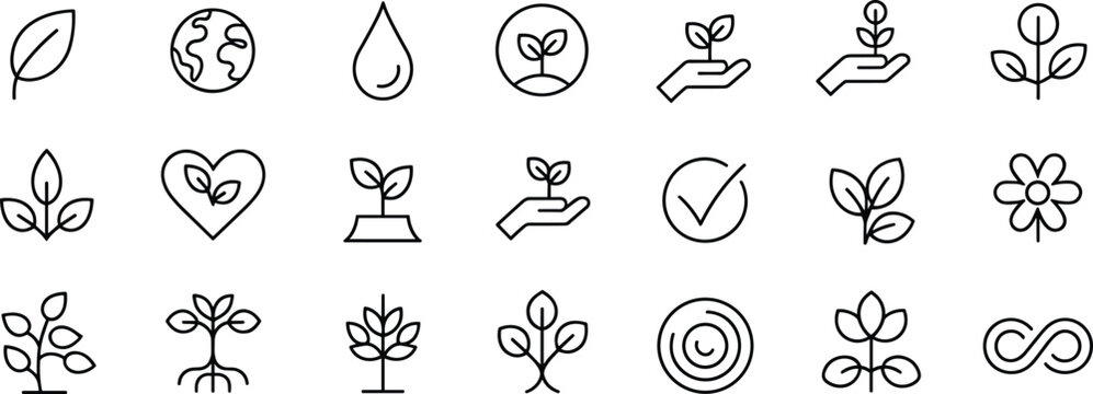 Collection of black outline icons representing nature growth and sustainability concepts leaf plant
