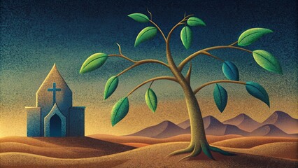 A surreal hourglass in a desert, where a lush forest gives life to a new sprout. A powerful concept of hope, regeneration, new beginnings, and environmental recovery.