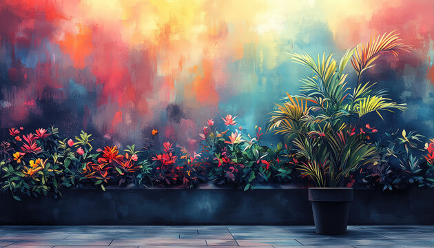 Vibrant garden scene with colorful flowers and lush greenery against painted backdrop. lively colors create cheerful , perfect for plant lovers