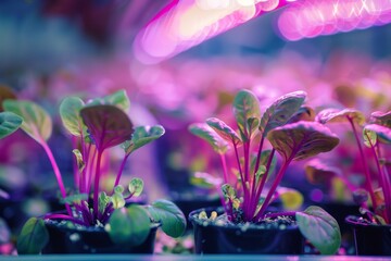 Chard seedlings growing indoors under purple LED lights in hydroponic plant factory Greenhouse with LED lighting and agricultural crops Salad farm in greenhouse
