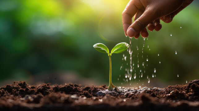 Hand watering young plant with droplets, symbol of nurturing, growth and ecological care