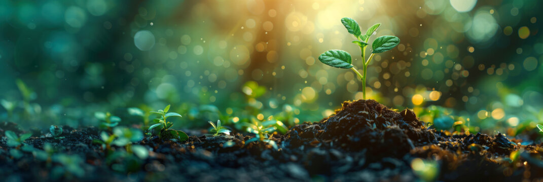 A small green plant grows from a microchip embedded in soil, symbolizing the fusion of nature and technology.