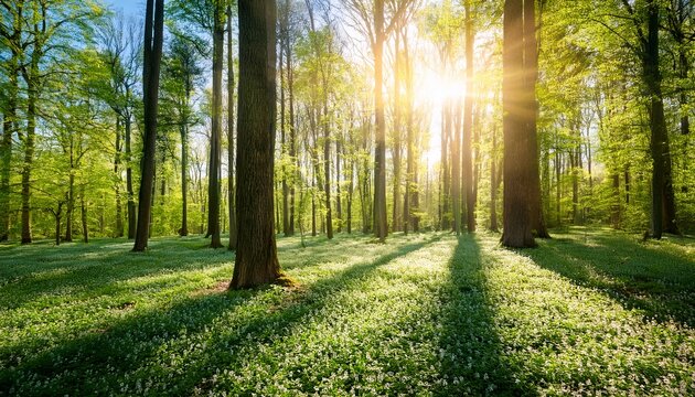 Beautiful landscape of a forest at sunrise or sunset. the sun is shining through the trees, creating a warm glow that illuminates the scene.
