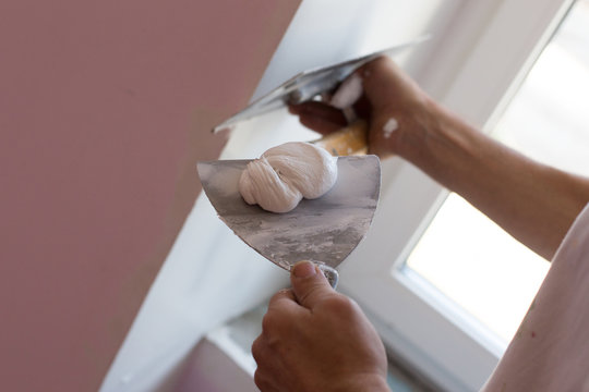 Plasterer man hand using trowel to plastering cement on concrete wall
