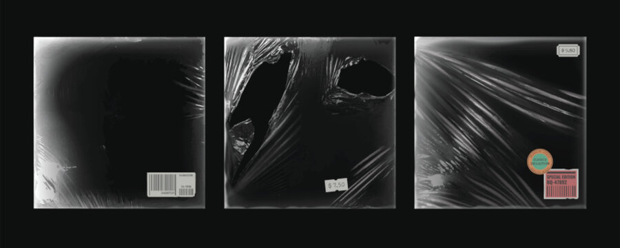 Vinyl cd album cover overlay for music record on black background. Vintage worn plastic wrap package design mockup. Transparent retro abstract tear disk pack template set. Rough poster border
