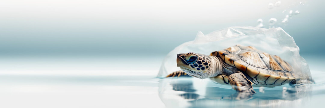 Turtle in plastic bag. Platic pollution problem. Environment concept. Protect turtles. Generative AI illustration