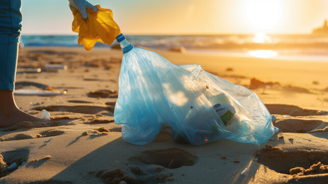 Person wearing gloves holding a bag filled with collected trash, participating in a beach cleanup