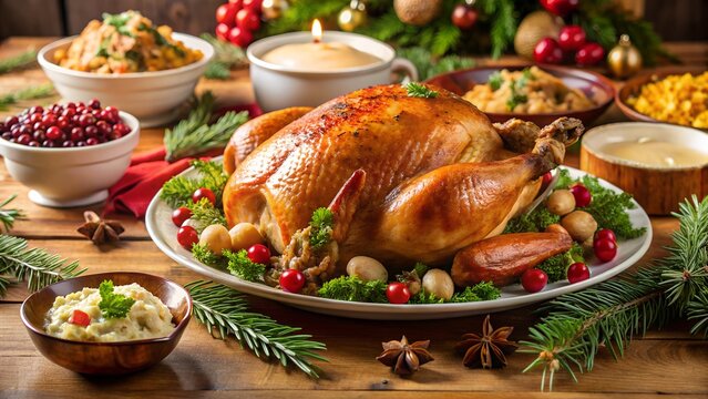 Delicious thanksgiving feast with roasted turkey and side dishes