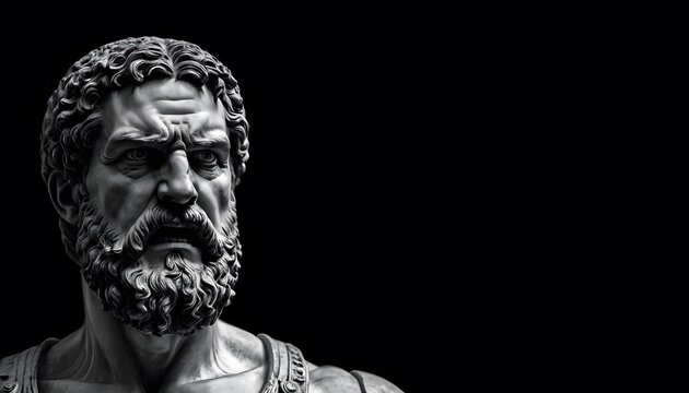 Statue of an ancient stoic philosopher thinking in the darkness. Black background.