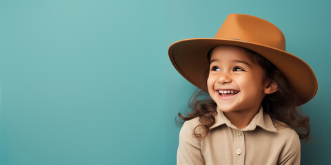 Banner with cute smiling girl in cowboy hat with empty space for text over teal background