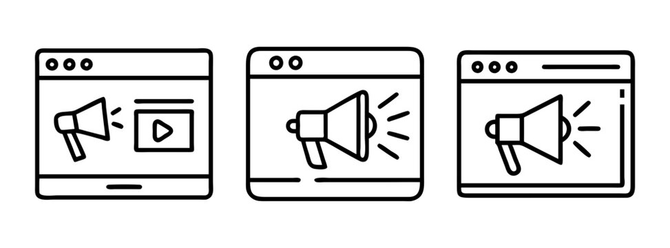 Minimalist black outline megaphone with play button icon and colorful confetti for live event announcement and celebration.