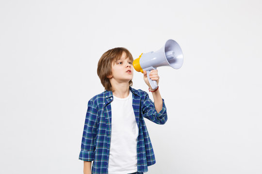 Fun little kid boy in blue t-shirt hold scream in megaphone, announces discounts sale isolated on white wall background children studio portrait. People childhood lifestyle concept. Mock up copy space