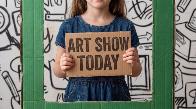 Smiling cartoon boy holds blank wooden sign. Young child with brown hair and big eyes shows empty board. Use for announcements, messages, or promotions. Kidfriendly announcement board.