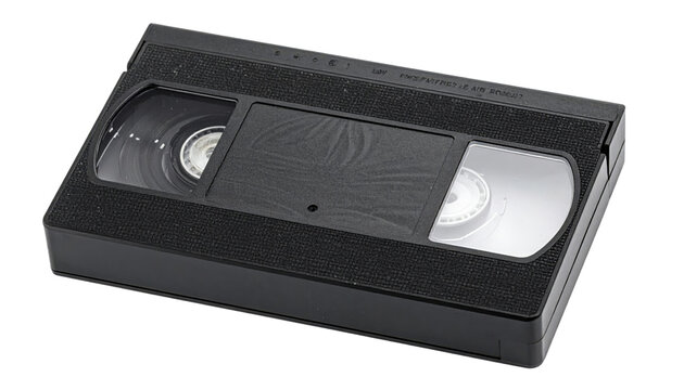 A black VHS tape with a textured surface and visible reels inside, representing vintage media storage and playback technology.