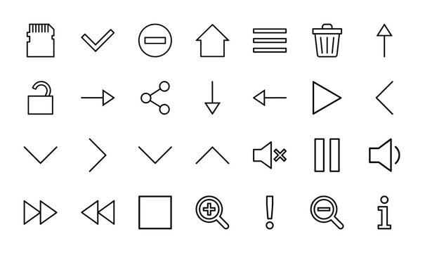 Interface line icon set. Vector pictograms of sd card, trash can, home, menu, volume, playback controls, share, and zoom, thin outline illustration.