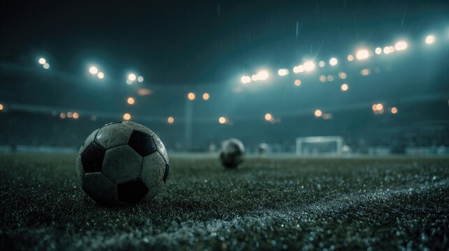 Rain-soaked soccer ball sits center-frame on a dark, wet field, under stadium lights, with blurred players and crowd in background