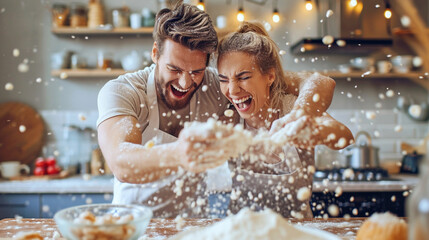 A couple having a playful food fight while baking, Valentine’s Day, date, couple, blurred background, with copy space