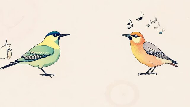 A playful illustration of two colorful birds chirping and interacting with each other, set against a light background. The cartoon style adds a cheerful and whimsical touch.