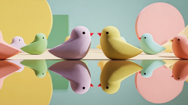 Colorful birds in playful arrangement on reflective surface with geometric shapes in background