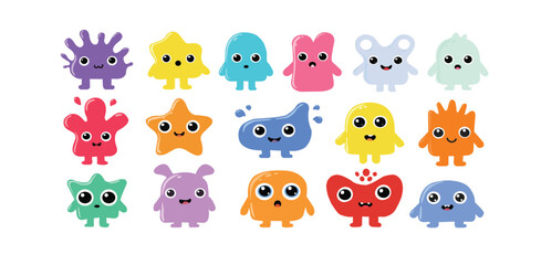 A collection of playful alien characters enclosed in bubbles, showcasing different colors and designs against a starry cosmic backdrop. Each character has a unique appearance and expression.