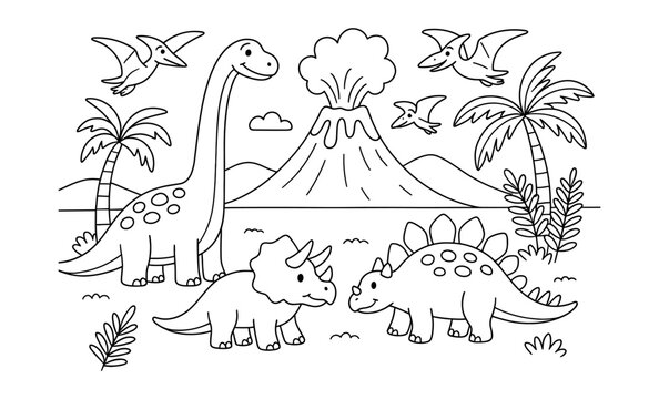 Cute dinosaur coloring page with volcano and prehistoric landscape