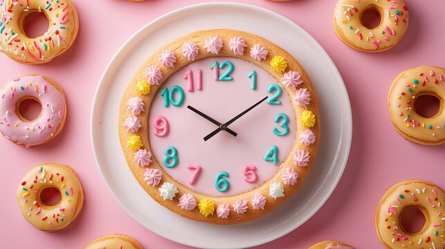 Playful Sweet Treat Clock Design Featuring Colorful Donuts on a Pink Background, Perfect for Party Themes and Dessert Lovers