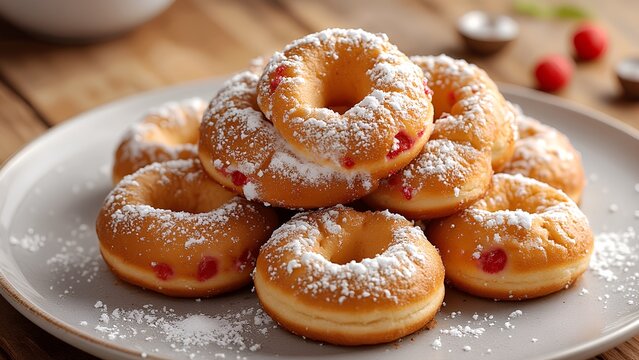 A delightful stack of glazed donuts dusted with powdered sugar, featuring cherry bits for added flavor, presented on a rustic wooden table.