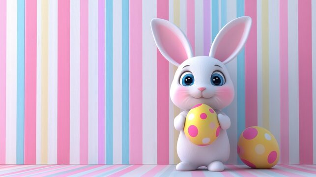 Easter bunny holding easter egg in front of a striped background