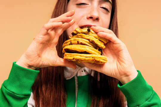 Messy Hands Holding a Stack of Syrupy Pancakes