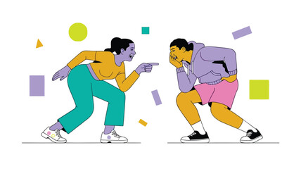 Two women in colorful casual wear arguing and pointing fingers at each other in a playful illustration