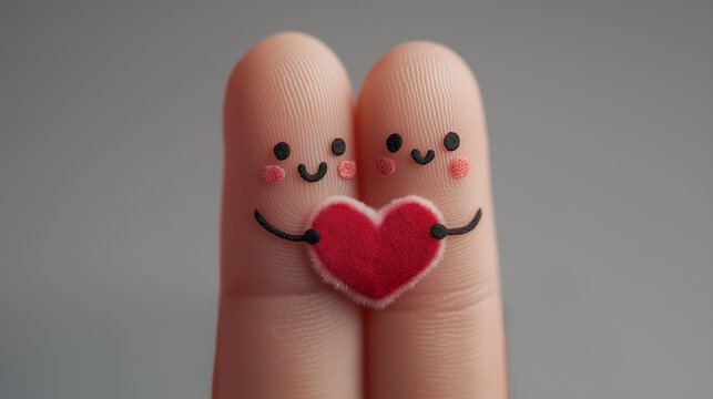 Two fingers with cute, smiling faces hold a red heart, conveying a playful and affectionate theme of love and friendship.