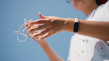 caucasian woman hands arranging earbuds under blue sky, sunlit fingers flashing droplets, white cords swinging, upbeat playful movements, smartwatch and summer tshirt visible, ready for music, scenes