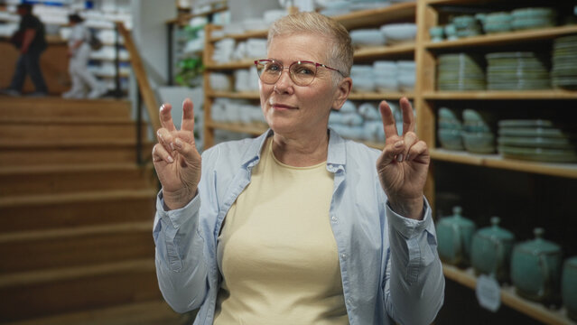 Middle aged woman showing air quotes with fingers in decor shop aisle among ceramic shelves; playful doubt.