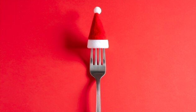 A whimsical still life presents a silver fork topped with a miniature santa hat against a vibrant red backdrop