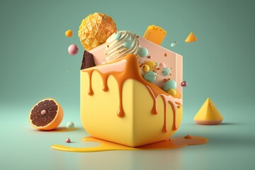 Fruit cake. Holiday cake with cream and fruit. Unusual, surreal sweets. Generative ai.