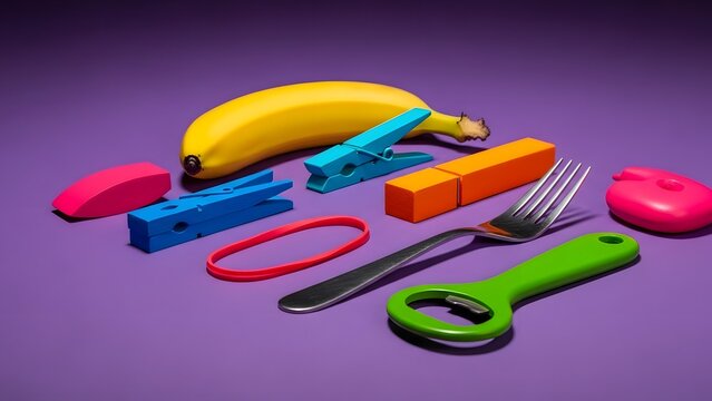 Assortment of Colorful Household Objects and Fruit on Purple Surface Keywords: still life, banana, clothespin, rubber band, bottle opener, fork
