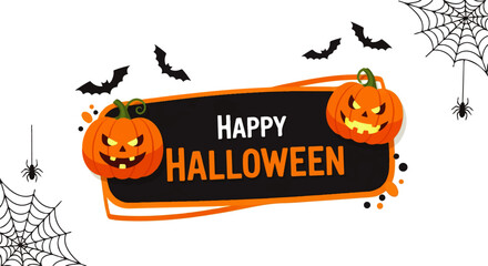Happy Halloween banner with smiling carved pumpkins, flying bats, and hanging spiders