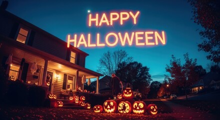 Festive happy halloween sign with carved pumpkins