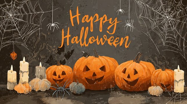 A colorful holiday illustration combines carved pumpkins, ghostly webs, and a traditional Halloween greeting.