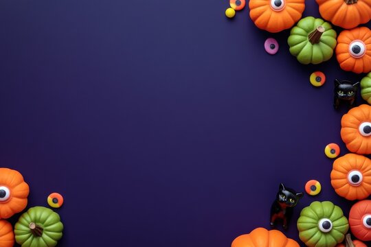Halloween composition featuring pumpkins with googly eyes and black cat figurines on a deep purple background