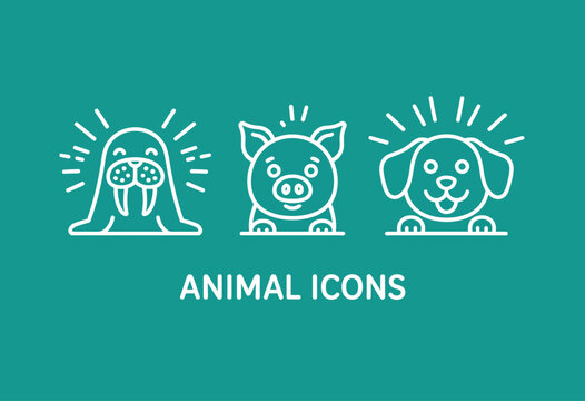 This playful set of animal icons features a walrus, pig, and dog, highlighting the charm and character of various animals in a simple yet effective graphic style.