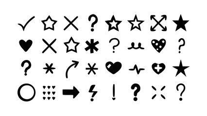 Expression icons. Comic emotion elements, hand drawn expressive symbols. Star, heart and sparks, speech bubbles, exclamation doodles for communication accent. Vector set