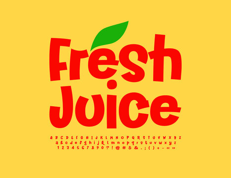 Vector creative logo Fresh Juice.  Playful Red Font. Modern Alphabet Letters and Numbers set