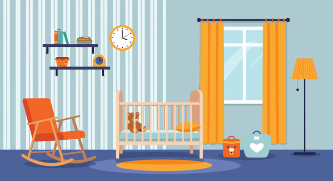 A cozy and colorful baby nursery interior with a wooden crib, rocking chair, bookshelves, window, and playful decor.