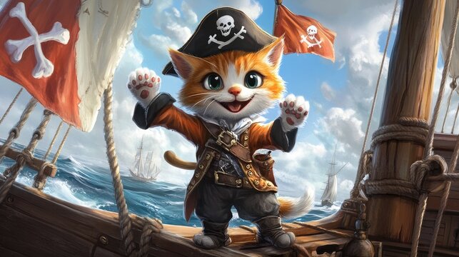 A cartoon cat in a pirate outfit, standing on a ship with a playful grin and a pirate flag.
