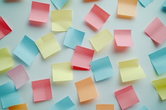 Levitating pastel colored sticky notes of various sizes against a minimalist light gray background create a dynamic and playful composition of organization and ideas