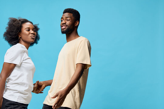 Young diverse couple enjoying a playful moment together against a vibrant blue background, showcasing their casual outfits and joyful expressions