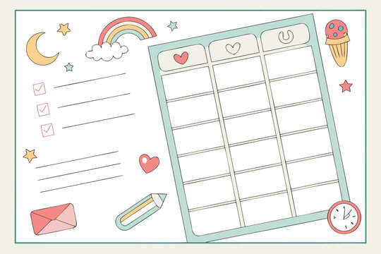 Cute and whimsical planner page with a checklist calendar grid and playful celestial and sweet treats illustrations for organized fun